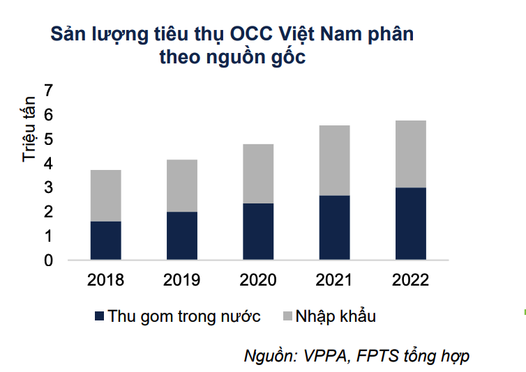 Cụ thể, nguyên liệu chính để sản xuất giấy bao bì tại Việt Nam vẫn chủ yếu là hộp carton cũ (OCC – old corrugated containers) và bột giấy nguyên sinh. Hiện nay, khoảng 85-90% nguyên liệu trong ngành bao bì giấy vẫn đến từ OCC, do đây là nguồn nguyên liệu có chi phí thấp hơn khoảng 3 lần so với bột giấy nguyên sinh. Sự phụ thuộc vào nguồn nhập khẩu của ngành giấy bao bì tại Việt Nam rất cao, đặc biệt là khi nguồn cung nguyên liệu OCC trong nước chỉ đáp ứng được khoảng 52% tổng nhu cầu tiêu dùng nội địa. Đối với bột giấy nguyên sinh, Việt Nam phải nhập khẩu đến 65% do nguồn cung trong nước không đủ, chủ yếu do dăm gỗ phân bố rải rác và khó tiếp cận, cũng như chi phí đầu tư cho nhà máy lớn. Đặc biệt, trong nước chỉ có 2 doanh nghiệp sản xuất bột giấy, nhưng chủ yếu để phục vụ cho dây chuyền sản xuất giấy nội bộ, chỉ một phần nhỏ được bán ra thị trường bên ngoài.