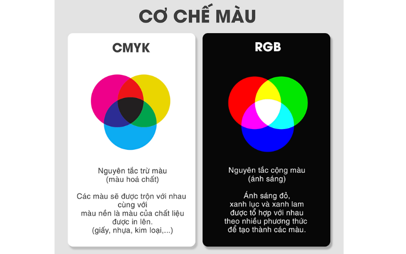 Ngược lại, sản phẩm in sử dụng mực in trên vật liệu (subtractive color model – CMYK). Mực Cyan, Magenta, Yellow, Black hấp thụ một phần ánh sáng trắng và phản xạ phần còn lại.